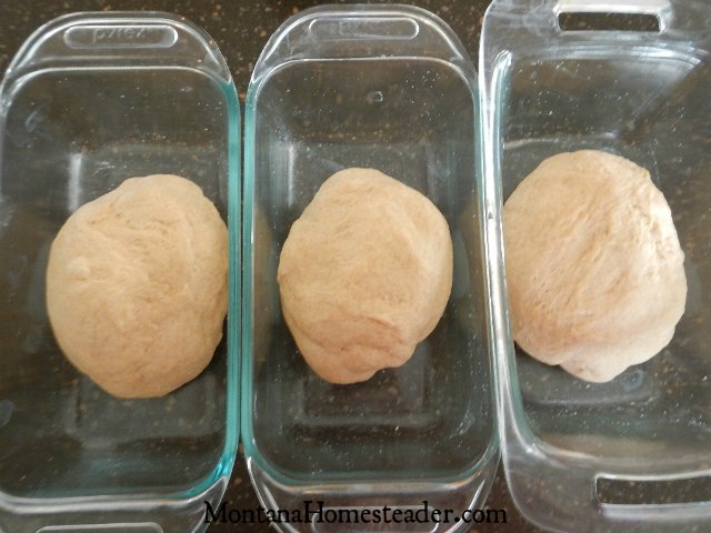 - Punch the dough down and remove it from the bowl. Separate the dough into thirds. Shape each piece into an oblong loaf shape and place one in each greased bread pan.