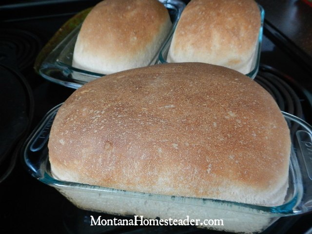 This recipe makes three nice size bread loves when baked in regular bread loaf pans. I like making bread in bulk like this so I can slice and freeze two loaves and keep one out for our family to eat right away. This bread recipe is a little too big to bake in the bread machine so instead I use my bread machine to mix up the dough and do the first rise. Then I split the dough in thirds, place one dough ball in each of our three glass bread loaf pans (these are the ones we use and love) greased with coconut oil and let them do their final rise before baking. If you want to fully mix, rise and bake this bread recipe in your bread machine you will need to cut the recipe in half.