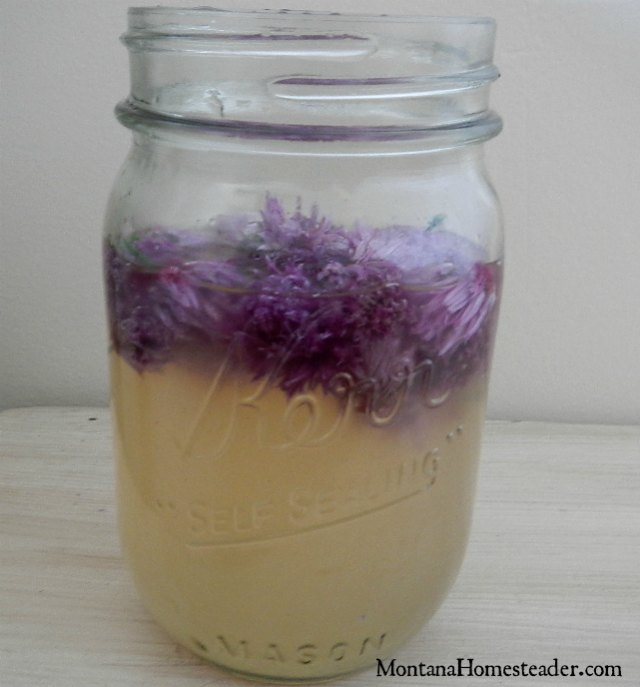 This recipe does not use exact quantities since how many chive flowers you harvest will dictate how much infused vinegar you make.