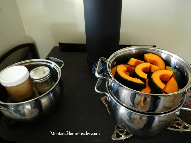 Anytime I have vegetables to steam, like winter squash, I use my large steamer pot on the wood stove. I used to chop up and steam winter squash in the electric oven but it takes a long time and often dries the squash out a bit. Now I chop the winter squash in half, scoop out the seeds and chop the squash into chunks. The chunks of squash are placed in the top pan of the steamer pot with an inch or two of water in the bottom pot. I put a lid on top, sit the steamer pot on the wood stove if it is running on low or on a trivet on the wood stove if it is burning super hot. The squash steams nicely in about half the time it would take in the oven and I used no electricity in the process. When it is done I can easily peel and puree the squash to use in one of our favorite recipes like this delicious squash soup. Just this last weekend I steamed a homegrown squash on our wood stove and we also warmed some of our honey we harvested in the fall that crystallized.