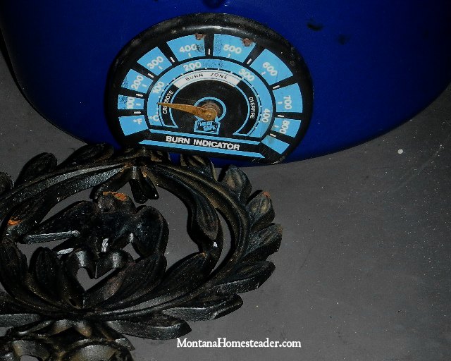 At 11am on a Sunday morning I put a raw, whole chicken in our favorite enameled cast iron pan. I stuffed the inside of the chicken with a chopped onion and several cloves of chopped garlic. I sprinkled salt, pepper, garlic powder and thyme on the chicken. Then I poured in 1/2 cup of water, put the lid on and sat the pan on the wood stove. I didn’t use any of our cast iron dutch ovens that we use for outdoor cooking since they all have legs to sit over hot coals and we wanted the pan to sit directly on the stove (at least for a little while). Initially I stuck our magnetic thermometer on the side of the roasting pan(this is the handy gadget we usually have on the wood stove pipe to gauge the heat intensity that I wrote about in this post or you can find them here). This was helpful to get an idea of how hot the pan was when sitting directly on the wood stove and when it was sitting up on a trivet.