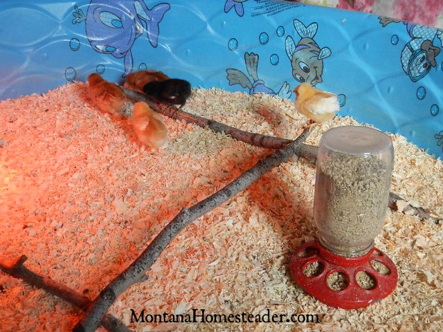 We laid a couple long sticks across the bottom of the brooder to create a low perch for the chicks.