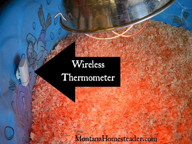 To assess and regulate the heat in the chick brooder, we used one of our wireless thermometers and installed the remote sensor in the chick brooder. I poked two small holes in the side of the plastic pool, threaded a small piece of wire through and strapped the wireless thermometer to the inside edge of the pool directly under the heat lamps. We had the base unit that read the temperature sitting on a table in the shop so we could easily check the temperature and adjust it as the chicks grew and the weather changed.