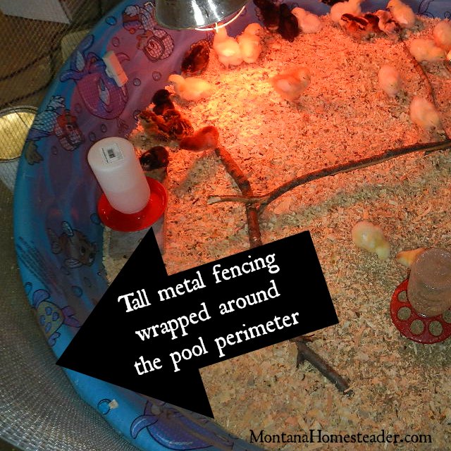 Last spring when we were getting ready to raise baby chicks for the first time, we needed a chick brooder but didn’t want to spend a lot of money on one. Montana in the spring is still pretty chilly so we knew we needed a chick brooder that our baby chickens wouldn’t outgrow in a week. We saw a lot of pictures of people making chick brooders out of plastic tubs or cardboard boxes. That definitely wouldn’t work for long since those baby chicks would run out of space quickly! We started looking around the homestead for things we could repurpose into a chick brooder. Alas we found the answer in one of the barns: Little A’s old plastic swimming pool! This cheap plastic swimming pool (only $10 at the local hardware store) got blown over in a wind storm at the end of the summer and cracked. It wouldn’t hold water anymore but it surely would make a great chick brooder!