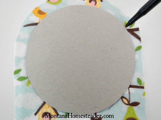 2. Lay the flannel fabric out in a single layer with the right side up. Lay the circle pattern on top and trace around the circle with a pen or pencil. Roughly cut out the fabric, it doesn’t have to be perfect since the excess will all be cut off later.