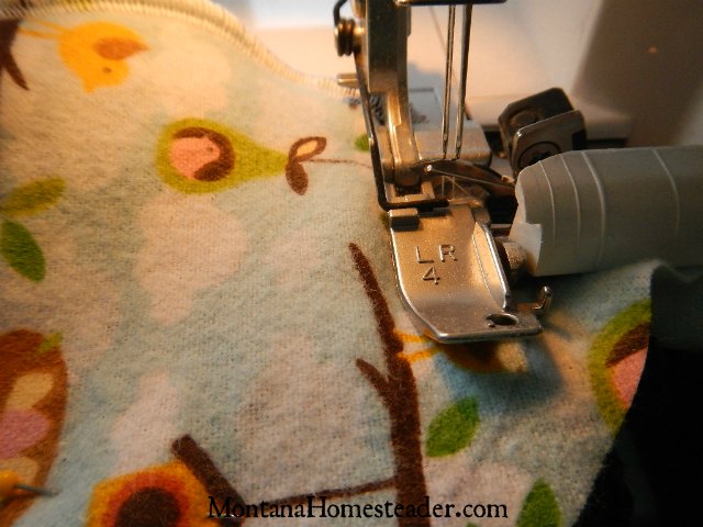 7. With the flannel fabric facing up, make sure the cutting feature is switched to “on” on the serger and serge around the edges keeping the outer foot guide on the pen line you traced on with the pattern.