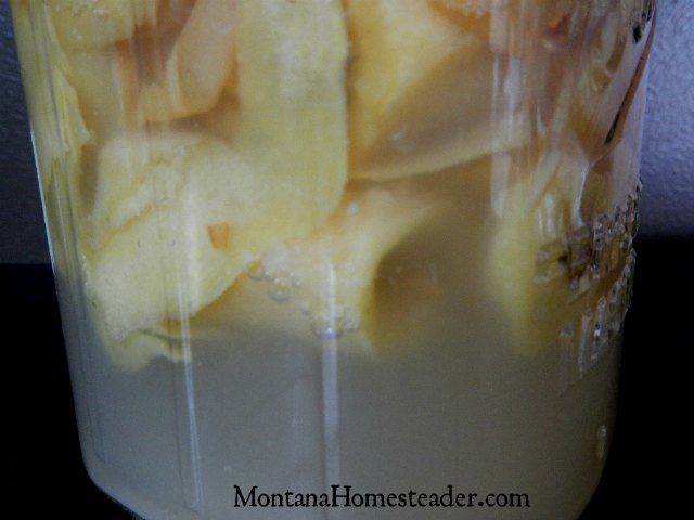 Next I put a piece of cheesecloth over top the mouth of the jar and put a rubber band around it to keep the cheesecloth on and fruit flies out. Then I stuck the jar in a corner on the counter out of direct sunlight. I stirred it once a day for the first week or two since the apple pieces were floating then and I didn’t want mold growing on it. Within a few days of starting the apple cider vinegar, you can see bubbles in it as it ferments. Here’s a close up picture of my second batch of homemade apple cider vinegar where you can see the fermenting bubbles.