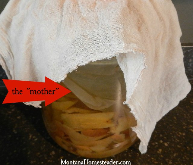 The most amazing part of this process is that the homemade apple cider vinegar I made grew its own Mother! For those of you who may not know what that means, the book Wild Fermentation explains it quite well, “You may observe a film or disk collecting on the surface of the vinegar. This is called the ‘mother-of-vinegar’, or ‘mother’ for short. It is a mass of vinegar making organisms that can be transferred to your next batch of vinegar as a starter. The mother is edible and nutritious, so there is no need to be afraid of it.” I actually tore off a piece of the mother from my first batch of homemade apple cider vinegar and gave it to a friend who used it to ferment her first batch of homemade ACV and it worked great!