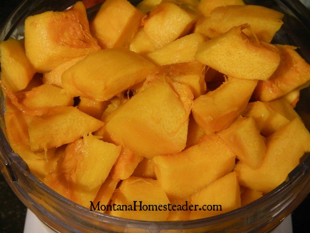 6. Cut the rind-less pumpkin into chunks about 1″-2″ long. Place the pumpkin chunks in the food processor. Process until the pumpkin is a smooth puree with no lumps left in it. Pumpkins and winter squash I turn into puree within a couple months of harvest make a very moist puree. It seems that once they sit in cool storage more than six months after harvest they start to lose some moisture and I have to add in a little water to the food processor when pureeing.