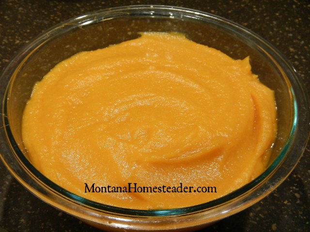 There are two methods I’ve tried for making a pumpkin puree. One method is to roast it in the oven, the second method is steaming it. I’ve processed and pureed more pumpkins and winter squash than I can count the last few years and I have to say that steaming is my preferred method. Why? First off, it is much faster than roasting in the oven. Secondly, the pumpkin seems to dry out a bit in the oven even when I put some water in the baking dish while it is roasting. The last couple years, I actually steam all our pumpkin and winter squash in a big steamer pot sat on the top of our wood stove! (If you missed our post on how to cook and bake on a wood stove, you can find it here)