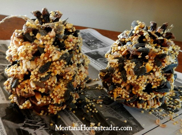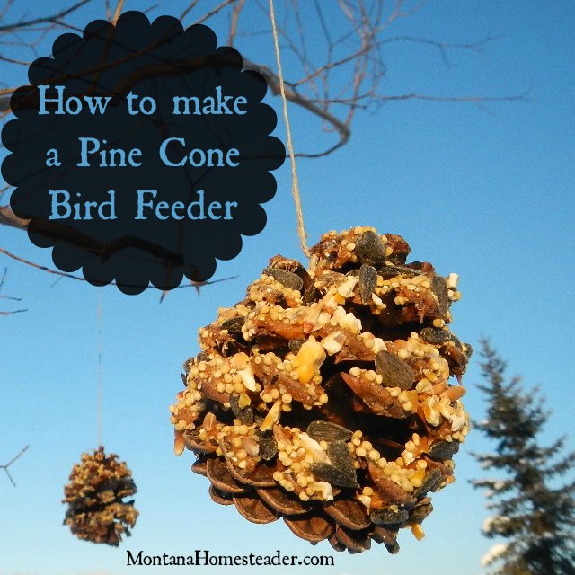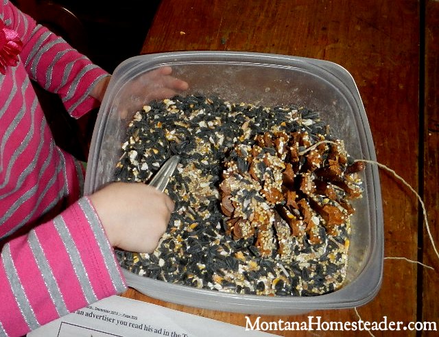 It is the middle of winter here in Montana and it is cold, cold, cold! We’ve had some days where it is so cold we don’t see any birds flying about the homestead other than the big raptors like red tail hawks who perch atop the power poles hunting the farm fields around us. We used to have a bird feeder hanging in the tree outside our front window so we could bird watch all winter long. Unfortunately the bird feeder broke during a heavy wind storm we had over the summer and I hadn’t replaced it before the cold weather hit. Little A and I love to craft and create on these cold winter days so we decided to embark on a project to make a pine cone bird feeder to feed our feathered friends outside.