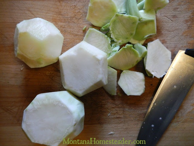 When growing kohlrabi, it is important to harvest it before it gets too big. If it gets too big, the kohlrabi will be woody and difficult to chew. To prepare the kohlrabi for preserving, cut off the root and leaves. Set the leaves aside since those can also be preserved. The outer skin of the kohlrabi bulb is thick so peeling it like a potato is not sufficient to remove the tough outer skin. Using a sharp knife, cut about 1/4″ off the outside of the kohlrabi.